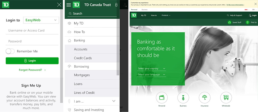 Architecture of navigation on TD Bank mobile and desktop site and prototype for user testing.