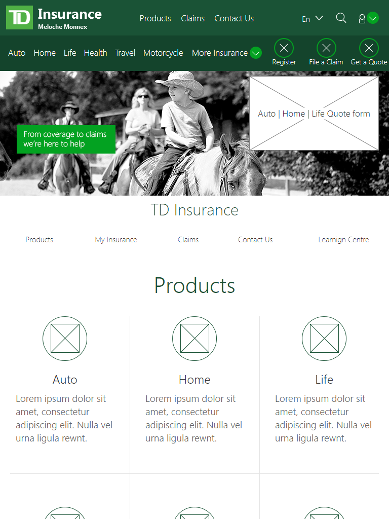 Research, presentations, wireframes, concepts and responsive HTML prototype covering mobile, tablet and desktop viewports for public TD Insurance line of business.