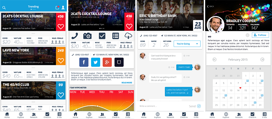Mobile application for event planning and networking with ability to search current events, send invitations, check in and rate events. I made an initial architecture and design followed by prototype for user testing and stakeholder presentations.